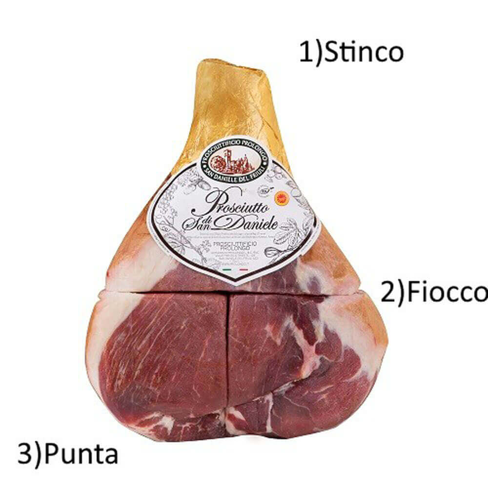 Stinco ”lägget”. San Daniele är naturligt lagrad skinka. Dock är San Daniele ljusare i färgen (trots den långa lagringstiden) samt har en mycket balanserad och distinkt smak. Det som gör San Daniele så unik och att den skiljer sig från övriga lufttorkade skinkor är att den har en delikat, len och söt smak istället för den robusta sältan som brukar följa med vällagrade lufttorkade charkuterier. Varje skiva har vita marmoreringar som bidrar till skinkans goda smak och mörhet. Den verkligen smälter i munnen!